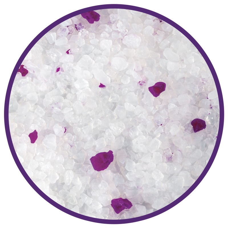 Наполнитель не требует постоянного контроля и ежедневной уборки кошачьего лотка. Содержимого пакета 7,6 л хватает в среднем на 2 месяца использования. Содержит фиолетовые гранулы c легким ароматом лаванды, активирующимся при контакте с жидкостью.