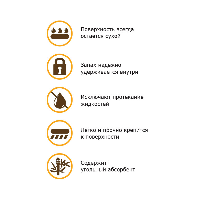 Подстилки имеют липкие фиксаторы, которые прочно крепятся к поверхности, что исключает заминание углов и протекания жидкости.