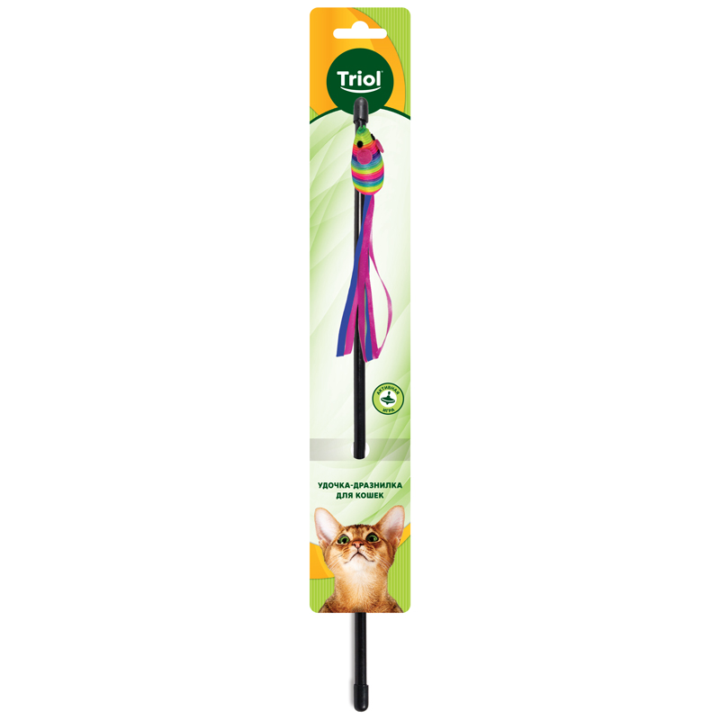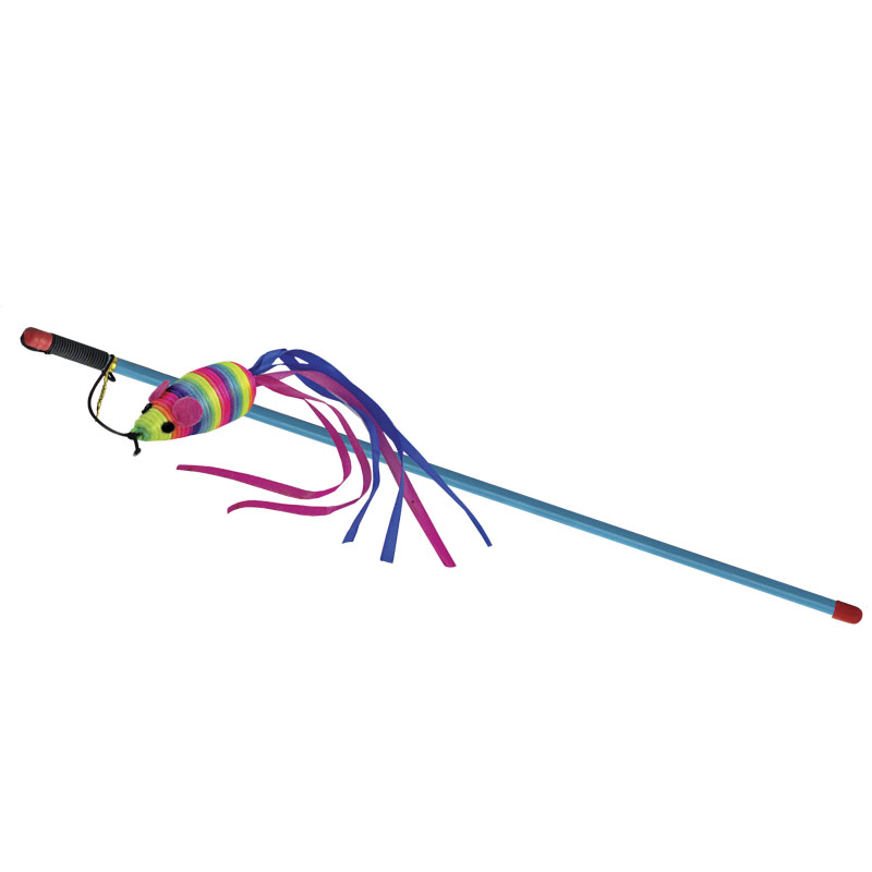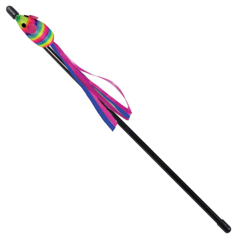Благодаря яркой мышке с цветными лентами на конце такая удочка-дразнилка способна надолго завладеть вниманием домашнего охотника.
