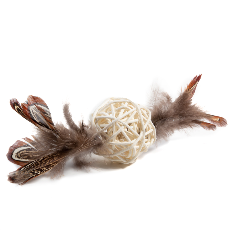 Игрушка для кошек "Плетеный мячик" дополнена колокольчиком и перьями.