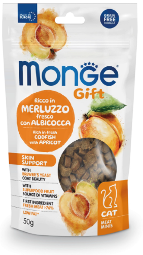 Monge Gift Cat Skin support Meat Minis Codfish — это дополнение к основному рациону для взрослых кошек.