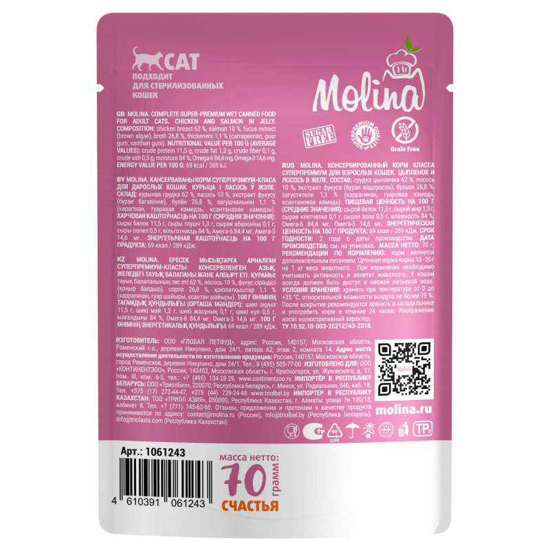 MOLINA Holistic Паучи с цыпленком и лососем в желе для взрослых кошек, 70 г