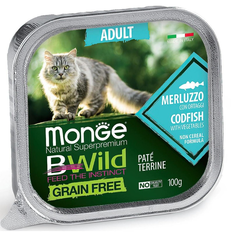 Monge Cat Bwild Grain free консервы из трески с овощами для кошек 100г - это полноценный сбалансированный рацион из трески с добавлением овощей для стерилизованных кошек.