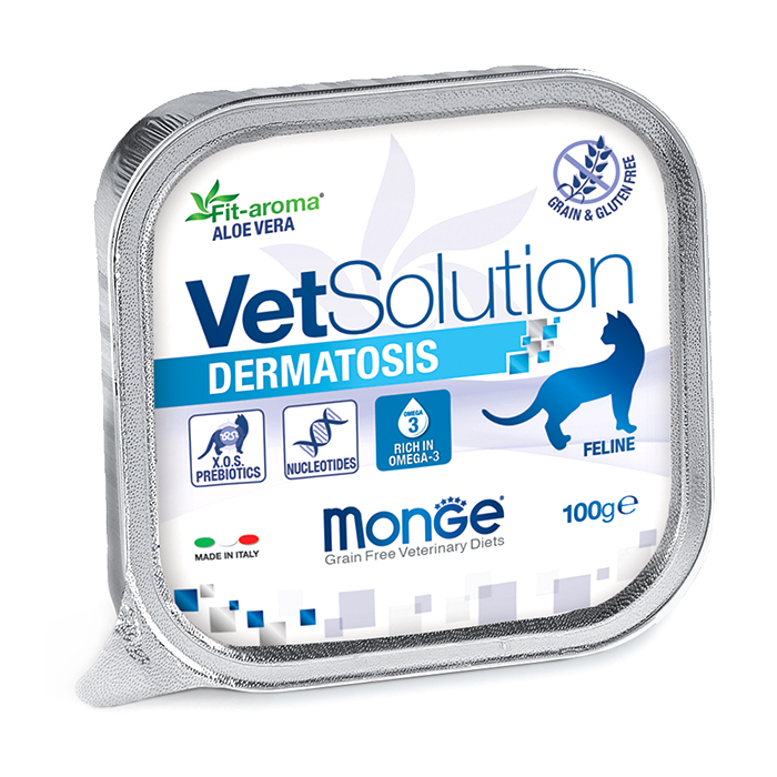 Monge Vetsolution Dermatosis — полнорационный консервированный диетический корм для кошек. Разработанный для поддержания функции кожи при дерматозе и чрезмерном выпадении шерсти у кошек.