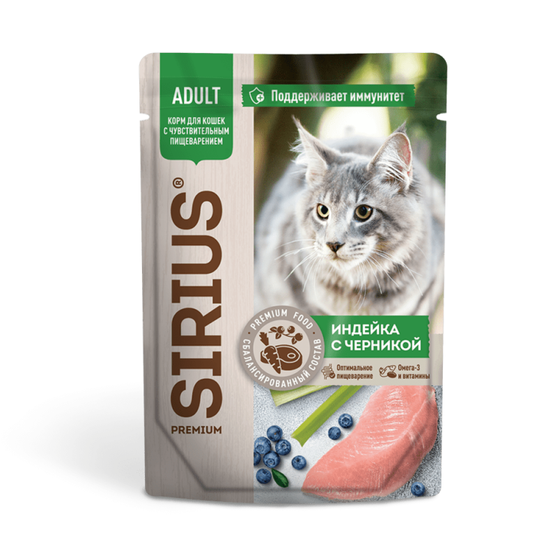 Состав: мясо, мясные и куриные субпродукты не менее 40% (в т.ч. индейка не менее 4%), злаки, черника, растительная клетчатка, витамины, минеральные вещества, льняное масло, таурин, пребиотик, экстракт юкки.