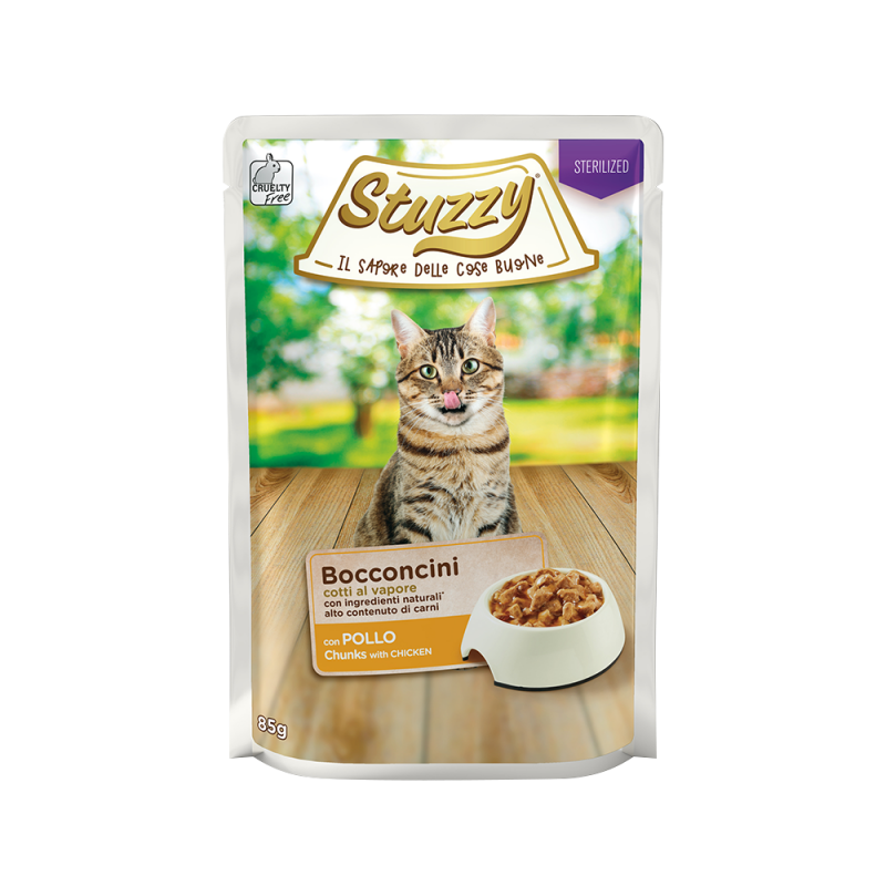 Ищете полноценный рацион для вашей стерилизованной кошки? Мы позаботились о ней с кусочками Stuzzy Sterilized с курицей, аккуратно приготовленными на пару из натуральных ингредиентов. Вкусные, простые и питательные — они станут её любимым лакомством!