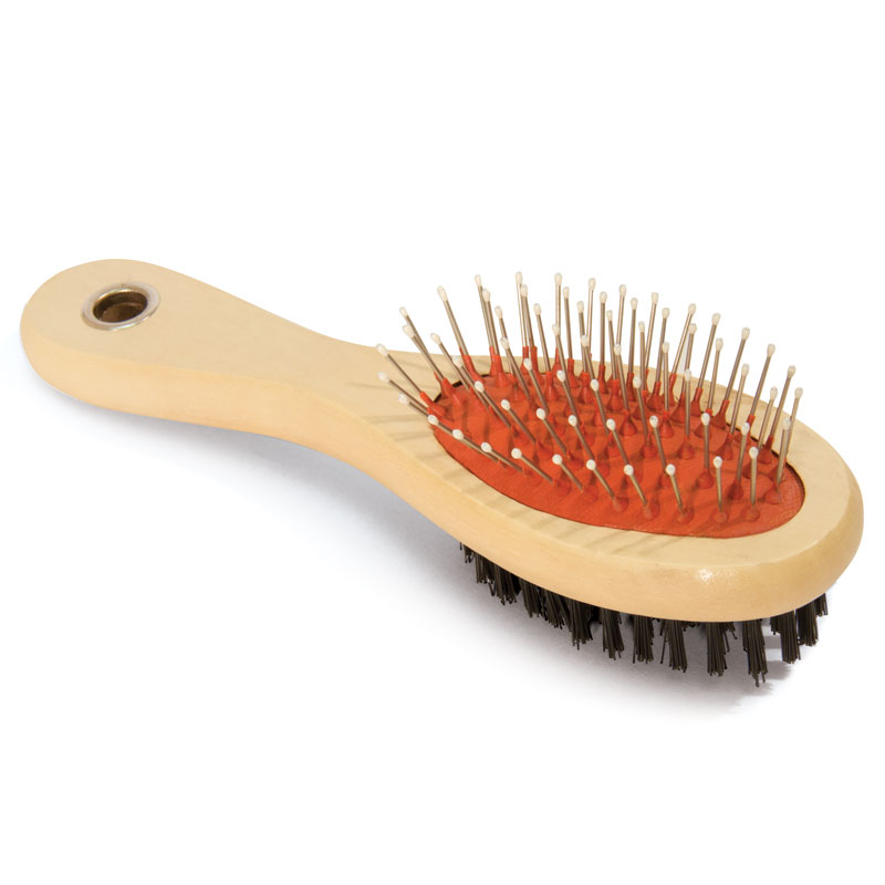 Двустороняя щетка овальной формы с деревянной ручкой обеспечивает нежный уход за верхним и базовым слоем шерсти животного. Нейлоновая щетина с одной стороны и металлическая с наконечниками с другой идеально подходят для питомцев с любым типом шерсти.