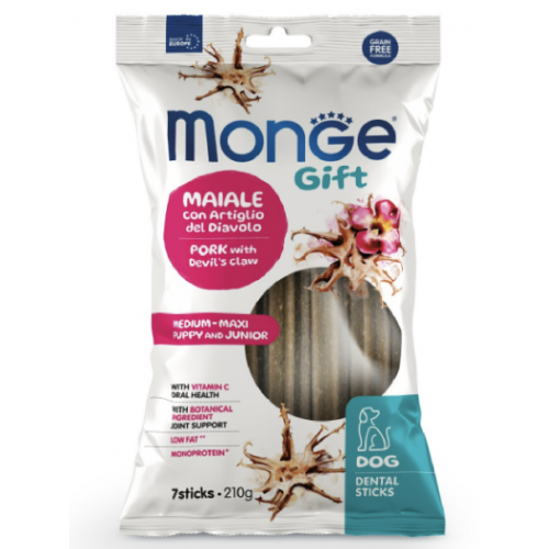 Monge Gift Dog Puppy and Junior Medium & Maxi (Свинина с коренем когтя дьявола) - это дополнительный корм для растущих щенков собак среднего и большого размеров.