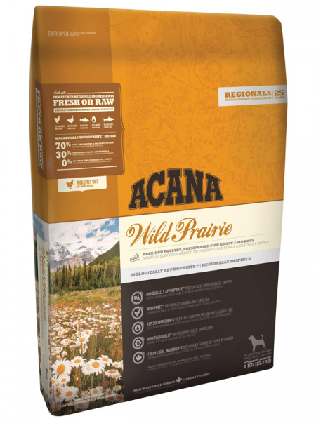 Корм ACANA Wild Prairie Dog содержит много мяса, выращенных на свободном выгуле, цыплят и индеек. А также цельные яйца и выловленную на воле рыбу. Все ингредиенты доставляются из нашего региона свежими или сырыми и используются в соотношении WholePrey («добыча целиком»), сохраняя все полезные вещества и не требуя включения большого списка искусственных добавок. Корм содержит мало углеводов, зато богат животным белком для поддержания отличной физической формы.