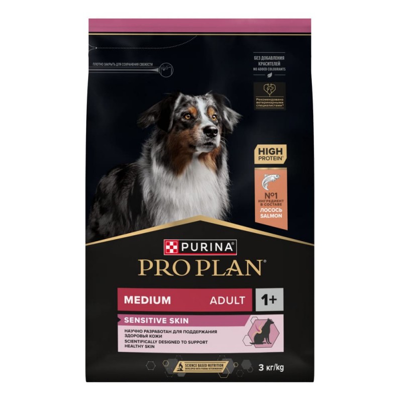 Purina Pro Plan Sensitive Skin Сухой корм с лососем для взрослых собак средних пород, упаковка 3 кг